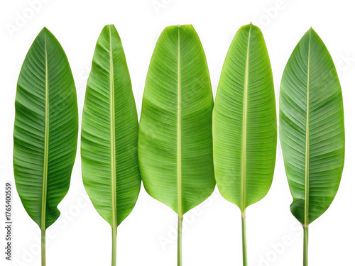 © MINTU, Fototapeta premium Five vibrant green banana leaves arranged in a row isolated on transparent background
