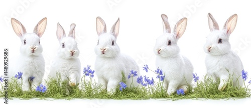 © Kzr808, Obraz premium Five white rabbits in grass with blue flowers. Spring, Easter