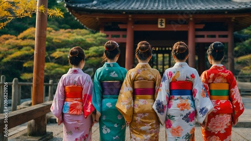 © ANGEL4289, Naklejka premium Five women in colorful kimonos stand together, facing a traditional Japanese temple, surrounded by lush autumn foliage.
