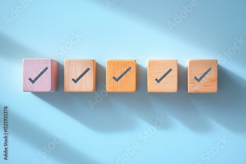 © video, Obraz premium Five wooden blocks with check marks lined up on a light blue surface casting shadows, symbolizing completion and approval