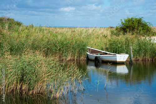 © loerke.foto, Fototapeta premium Fjordlandschaft: ein weißes einsames Holzboot mit Rudern liegt vertäut im Schilf auf einem dänischen Fjord