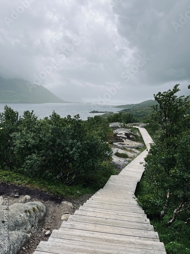 Fototapeta premium Fjords coastline, ocean bay coastline, cloudy foggy sky