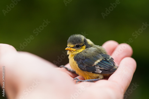© mabofoto@icloud.com, Obraz premium Flügge gewordenes Meisen Küken in der Hand
