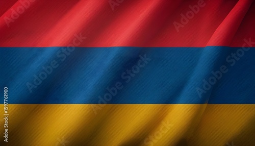 © Вячеслав Краснов, Naklejka premium Flag of Armenia gently waving in a soft breeze against a blurred background, symbolizing national pride and identity in a serene outdoor setting Generative AI