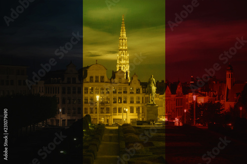 © MXW Photo, Naklejka premium Flag of Belgium in minimalistic design composition skyline Brussels