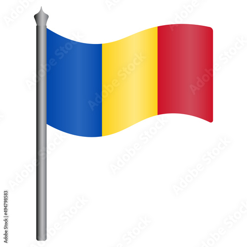 © Gebbi Mur, Obraz premium Flag of Romania. Color vector illustration. The fabric is decorated with three vertical stripes. The national symbol of the state develops in the wind. Flat style. Isolated background. Political theme