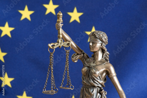 © studio v-zwoelf, Fototapeta premium Flagge der EU und Justizia Statue
