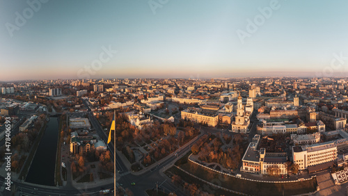 © Kathrine Andi, Fototapeta premium Flagpole with flag of Ukraine with epic sunny autumn cityscape. Panoramic aerial view above river Lopan embankment near Dormition Cathedral in Kharkiv, Ukraine