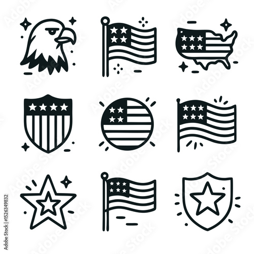 Naklejka premium Flags icon USA nine black and white icons representing the United States suitable for patriotic designs, educational materials, and historical presentations.