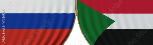 © Alexey Novikov, Naklejka premium Flags of Russia and Sudan and closing or opening zipper between them. Political negotiations or interaction conceptual 3D rendering