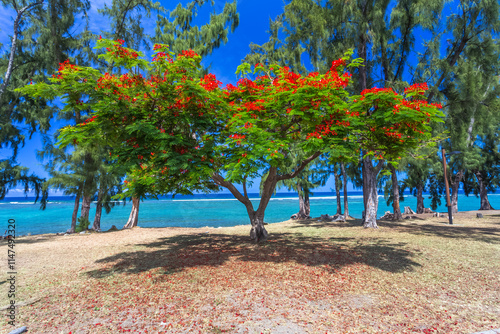 © Unclesam, Fototapeta premium Flamboyant sur plage de Saint-Leu, île de la Réunion