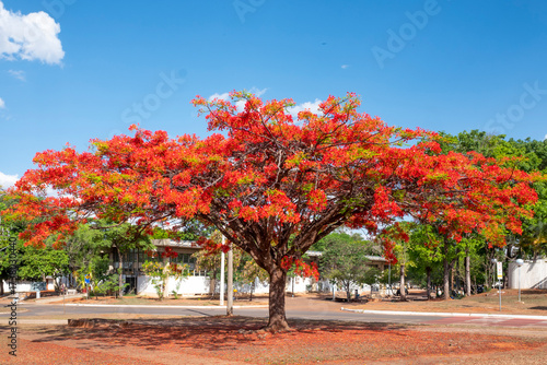Naklejka premium Flamboyant tree with its orange flowers, Delonix regia, also called royal poinciana, or peacock tree, Brasília, Brazil, Dec 2022