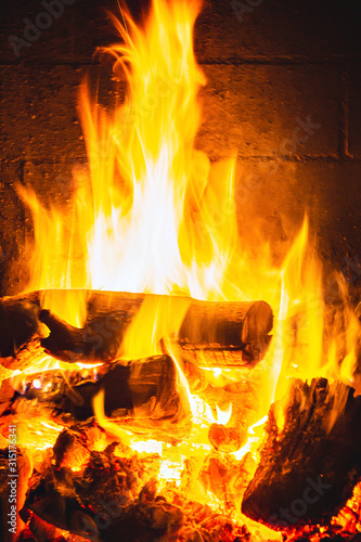© Luis, Fototapeta premium Flames burning a bonfire with coals, fireplace, close-up
