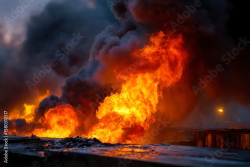 © Niken, Obraz premium Flames engulf a structure generating thick dark smoke against a dim backdrop