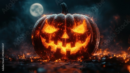 Naklejka premium Flaming Halloween pumpkin on fire under a full moon.
