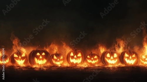 Naklejka premium Flaming Jack-o'-lanterns glow darkly on a spooky Halloween background...