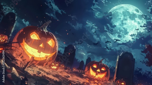 Naklejka premium Flaming pumpkins light up a graveyard as zombies roam beneath a full moon,...