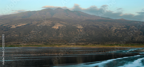 Obraz premium Flamingi w wodzie w pobliżu brzegu jeziora Natron. Kolonia flamingów. Panorama. Widok z lotu ptaka. Tanzania.