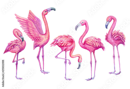 © airmel, Naklejka premium Flamingo akwarela tropikalny zestaw. Ilustracja egzotyczne rajskie ptaki.