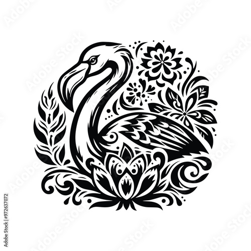 © Cici, Obraz premium Flamingo bird in folk art black and white silhouette illustration