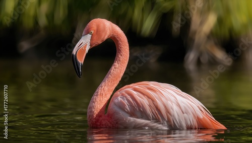 Fototapeta premium Flamingo bird standing in water, showcasing its vibrant body and features, highlighting its natural habitat