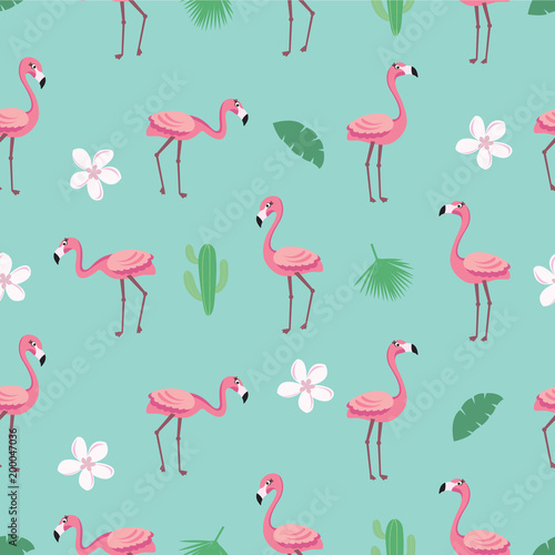 Obraz premium Flamingo pattern - trendy seamless pattern in flat style with flamingos, tropical flowers, leaves and cactus. Vector illustration design template