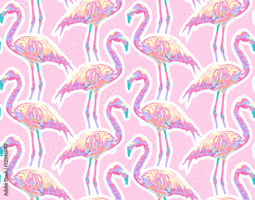 © nuch, Naklejka premium Flamingo Seamless Pattern Art On Blue-Sky Color Background Wallpaper, Tropical Animal Art Pattern