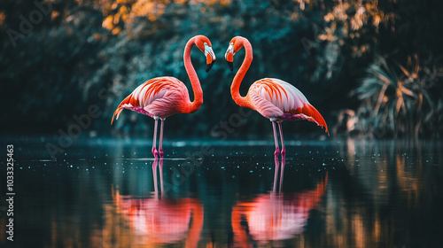 © Jiranun, Fototapeta premium Flamingo standing on the river