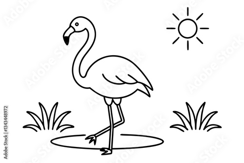 © Pinak, Fototapeta premium flamingo wading in a pond with the sun shining line art silhouette vector illustration