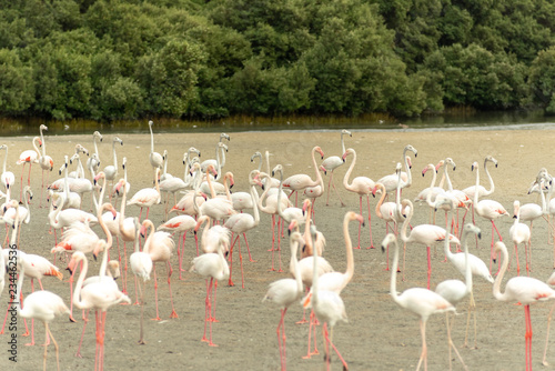 Naklejka premium Flamingoes in Ras Al Khor Wildlife Sanctuary, Ramsar Site, Flamingo hide2, Dubai, United Arab Emirates