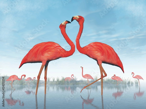 © Elenarts, Obraz premium Flamingos courtship - 3D render