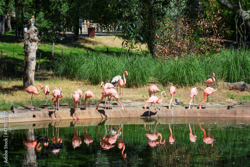 Naklejka premium Flamingos drinking in a pond with their reflection