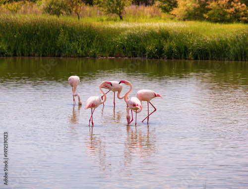 Fototapeta premium Flamingos feeding in the lagoon