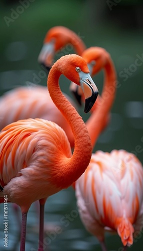 © Julija, Obraz premium Flamingos gather in a tranquil pond, their orange feathers reflecting in water. They interact playfully, creating a stunning display of nature. Flamingo Phoenicopterus is genus of birds. Generative AI