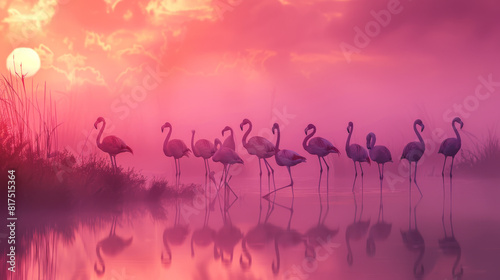© Armin, Naklejka premium Flamingos immersed in a dreamlike landscape with mist and a soft pink backdrop during sunset