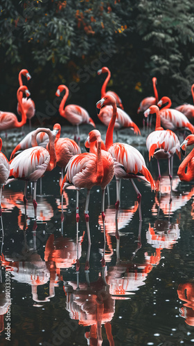 Naklejka premium Flamingos in a pond with reflections, surrounded by trees