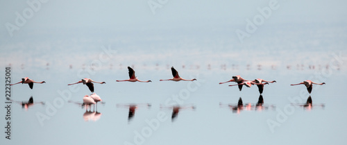 Obraz premium Flamingos in flight. Flying flamingos over the water of Natron Lake. Lesser flamingo. Scientific name: Phoenicoparrus minor. Tanzania.