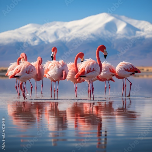 Obraz premium Flamingos in Water with Mountain Range