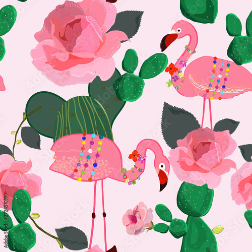Obraz premium Flamingos pattern. Seamless pattern for textile design. Flamingos. Exotic birds. Hand drawn pink roses with cactus. Tropical vector seamless floral pattern