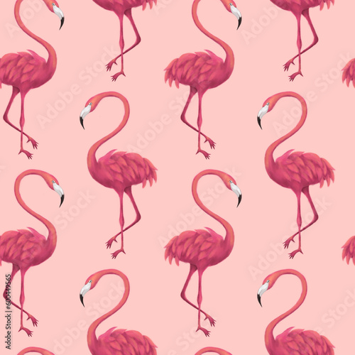 Obraz premium Flamingos Pink Seamless Pattern. Raster Illustration of Summer Tropical...