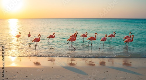 Fototapeta premium Flamingos sunrise beach scene