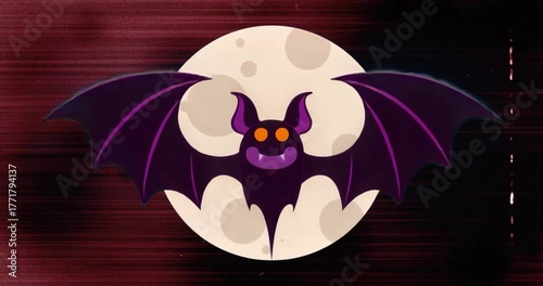 Fototapeta premium Flapping cartoon bat spreading purple wings in abstract night scene, with full moon silhouette