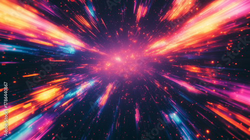 © Oxana, Fototapeta premium Flash explosion in space abstract background design. Explosive light speed rays effect - concept poster. Digital art.