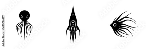 Fototapeta premium Flat black icons of marine life featuring an octopus, a squid, and a fish...