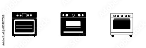 © Andrei, Obraz premium Flat black icons of three different kitchen ovens displayed on a white background highlighting modern appliance design