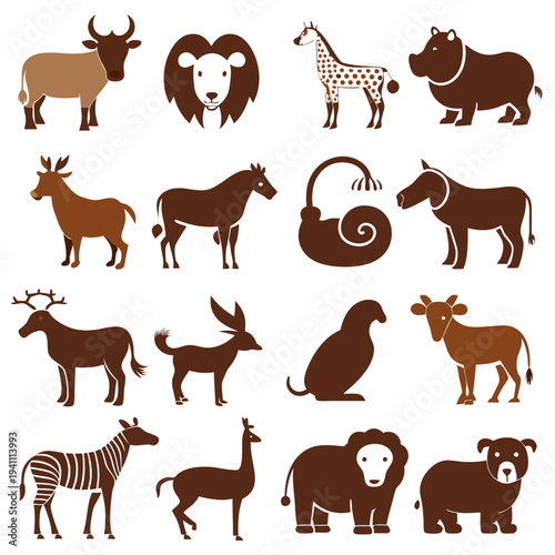 © Xihan, Fototapeta premium Flat brown animal icons set on a white background