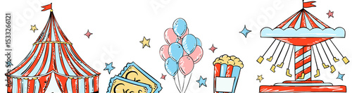 Naklejka premium Flat carnival icons on transparent bg showing circus tent tickets balloons popcorn carousel stars