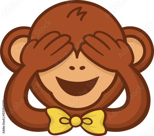 © vectorfusionart, Naklejka premium Flat cartoon monkey character is covering eyes, wearing yellow bow tie on transparent background