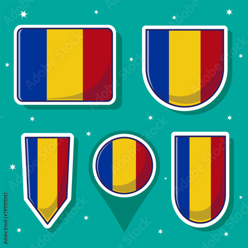 Fototapeta premium Flat cartoon vector illustration of Romania national flag with many shapes inside