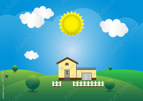 Naklejka premium Flat classical house with fence and bushes and sky nature in mountian. Modern...
